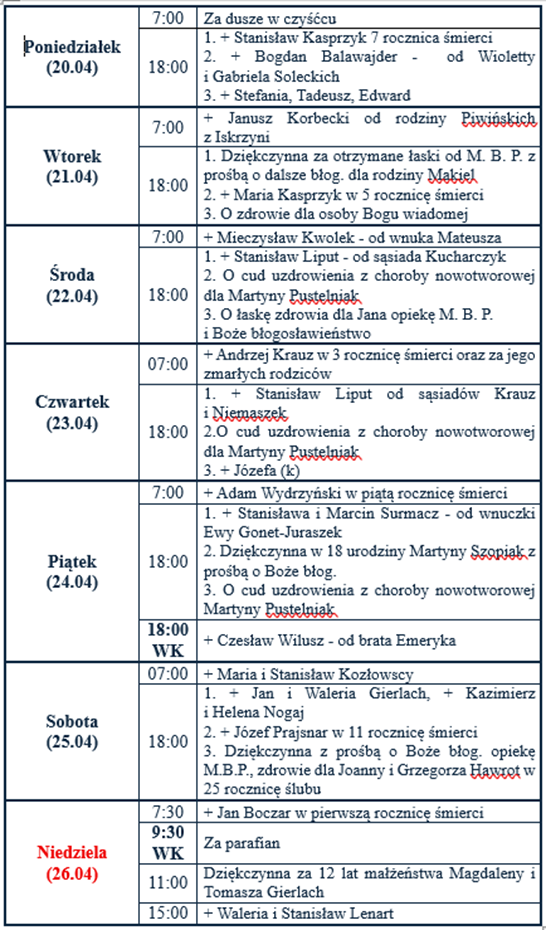 Intencje Mszy Świętych - 20.04.2026 - 26.04.2026